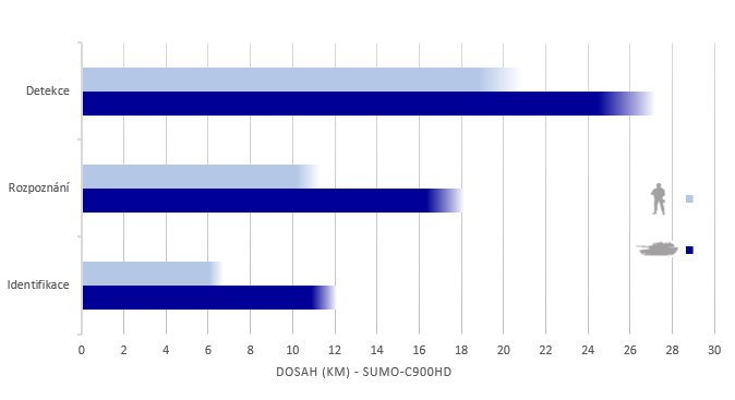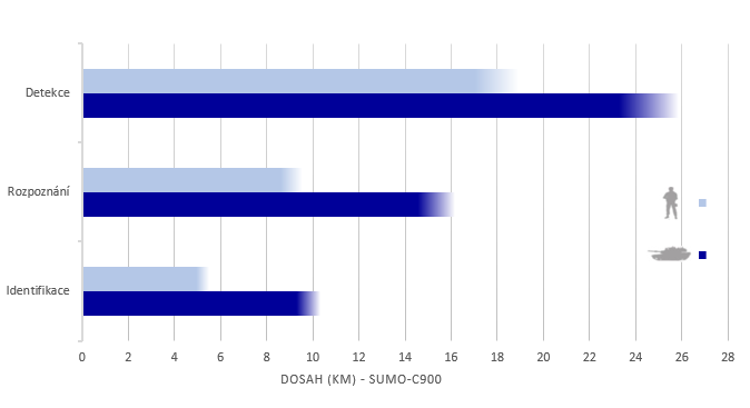Kamera SUMO-C900 je vysoce citlivá chlazená termovizní kamera v pásmu středních vln, navržená pro integraci do širokého spektra aplikací s více senzory (např. elektro-optické systémy s radary, denními/nočními kamerami, světlomety, LRF, GPS apod.) Díky ostrému obrazu umožňuje termokamera SUMO-C900 detekovat lidský cíl na vzdálenost více než 19 km a termokamera SUMO-C900HD na více než 20 km.