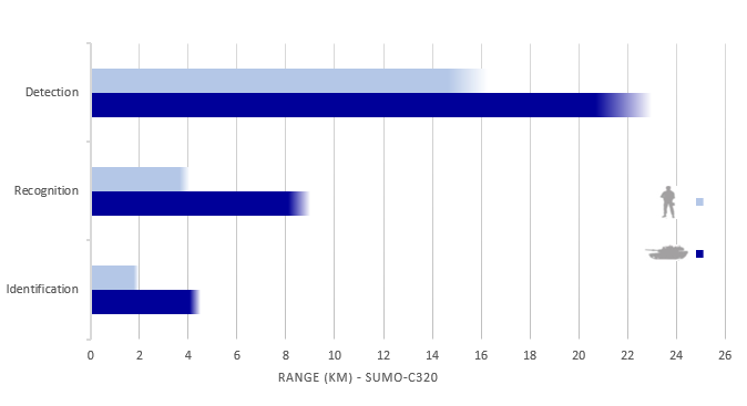 SUMO-C320 is a sensitive midwave cooled thermal camera developed for integration into a wide variety of multi-sensor applications. This camera is used in middle range applications providing a very sharp thermal image with an ability to detect human targets at a distance of more than 10 km.